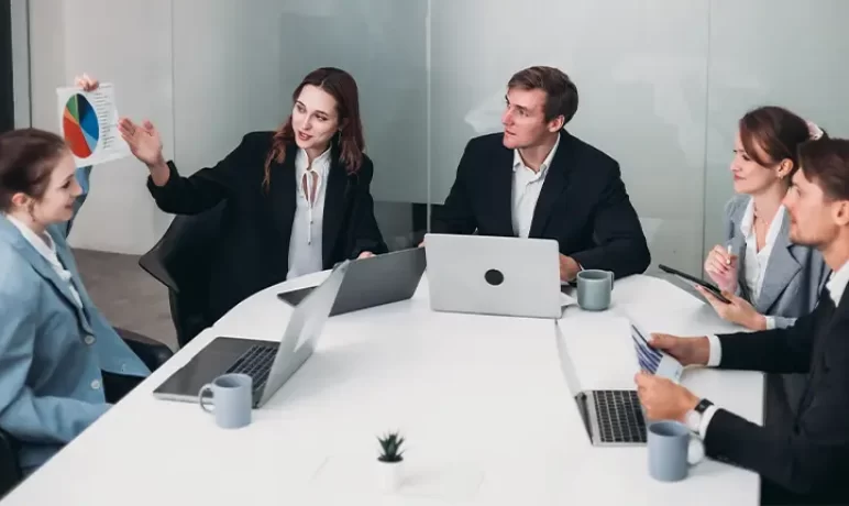 In een meeting op kantoor maak je duidelijk en rustig je punt. “Ik stel voor dat we dit proces aanpassen, omdat het slimmer kan.” Je verheft je stem niet, maar komt met goede argumenten om je standpunt te onderbouwen.